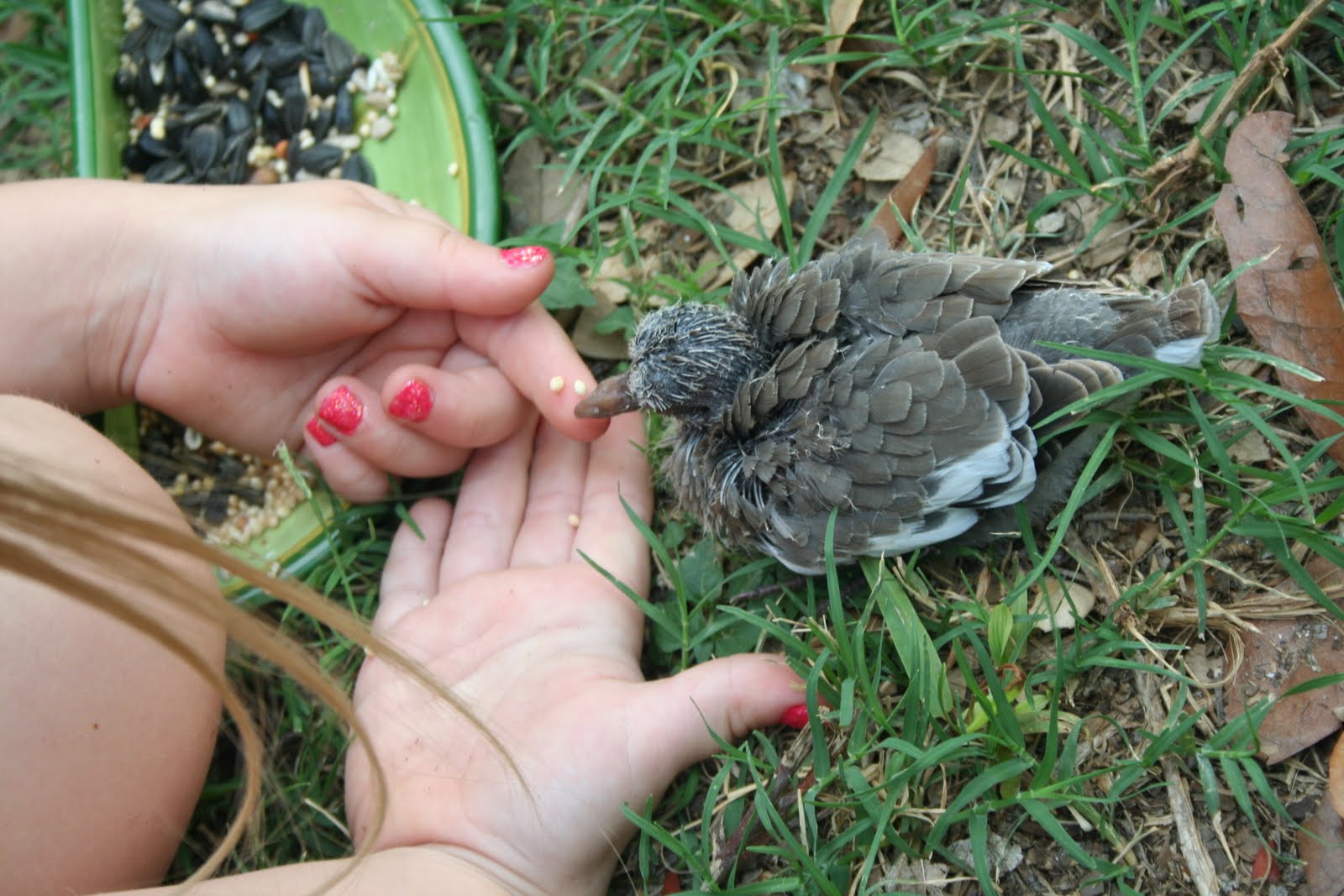 We kept her for 4 days in the box and would let her out to walk around and get strong in the back yard. She seemed to be gaining strength, and almost flying out of the box, so we were hopeful she would make it. The girls went to school on Thursday, and when they came home Tweetie was gone. She must have flown away to her Mommy the girls guessed. They saw a little older bird in the front the next day and exclaimed that must be Tweetie's brother! So it was a happy ending to our bird keeping days for the girls.